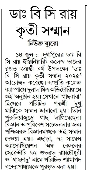 Dr. B. C. Roy Kriti Samman 2025 Honors Environmental HeroesOn June 13, 2025, Dr. B. C. Roy Engineering College, Durgapur, celebrated its Silver Jubilee with the “Dr. B. C. Roy Kriti Samman” at Dulal Mitra Auditorium. Four environmental champions were honored: Padma Shri Mr. Dukhu Majhi (‘Gachh Baba’) for planting thousands of trees in Purulia, Paschimbanga Vigyan Mancha for promoting scientific and environmental awareness, Dr. Subhabrata Roychaudhuri for advancing public science education, and Mr. Shyamapada Bandyopadhyay (‘Gachh Dadu’) for afforestation in Bankura.The event featured a cultural performance by Mr. Somnath Banerjee’s team, a welcome address by Principal Dr. Sanjay S. Pawar, and felicitations by Mr. Tarun Bhattacharya and other Society members. Awardees encouraged tree planting and conservation. Durgapur’s Divisional Forest Officer, Mr. Anupam Khan, attended. The ceremony ended with the National Anthem, followed by tree planting on campus. Two B.Tech students, Gaurav Kumar and Pritam, were also recognized for securing Ph.D. positions at IIT BHU.