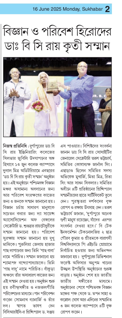 Dr. B. C. Roy Kriti Samman 2025 Honors Environmental HeroesOn June 13, 2025, Dr. B. C. Roy Engineering College, Durgapur, celebrated its Silver Jubilee with the “Dr. B. C. Roy Kriti Samman” at Dulal Mitra Auditorium. Four environmental champions were honored: Padma Shri Mr. Dukhu Majhi (‘Gachh Baba’) for planting thousands of trees in Purulia, Paschimbanga Vigyan Mancha for promoting scientific and environmental awareness, Dr. Subhabrata Roychaudhuri for advancing public science education, and Mr. Shyamapada Bandyopadhyay (‘Gachh Dadu’) for afforestation in Bankura.The event featured a cultural performance by Mr. Somnath Banerjee’s team, a welcome address by Principal Dr. Sanjay S. Pawar, and felicitations by Mr. Tarun Bhattacharya and other Society members. Awardees encouraged tree planting and conservation. Durgapur’s Divisional Forest Officer, Mr. Anupam Khan, attended. The ceremony ended with the National Anthem, followed by tree planting on campus. Two B.Tech students, Gaurav Kumar and Pritam, were also recognized for securing Ph.D. positions at IIT BHU.